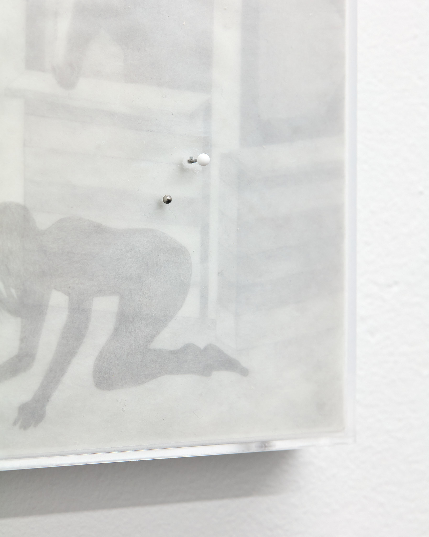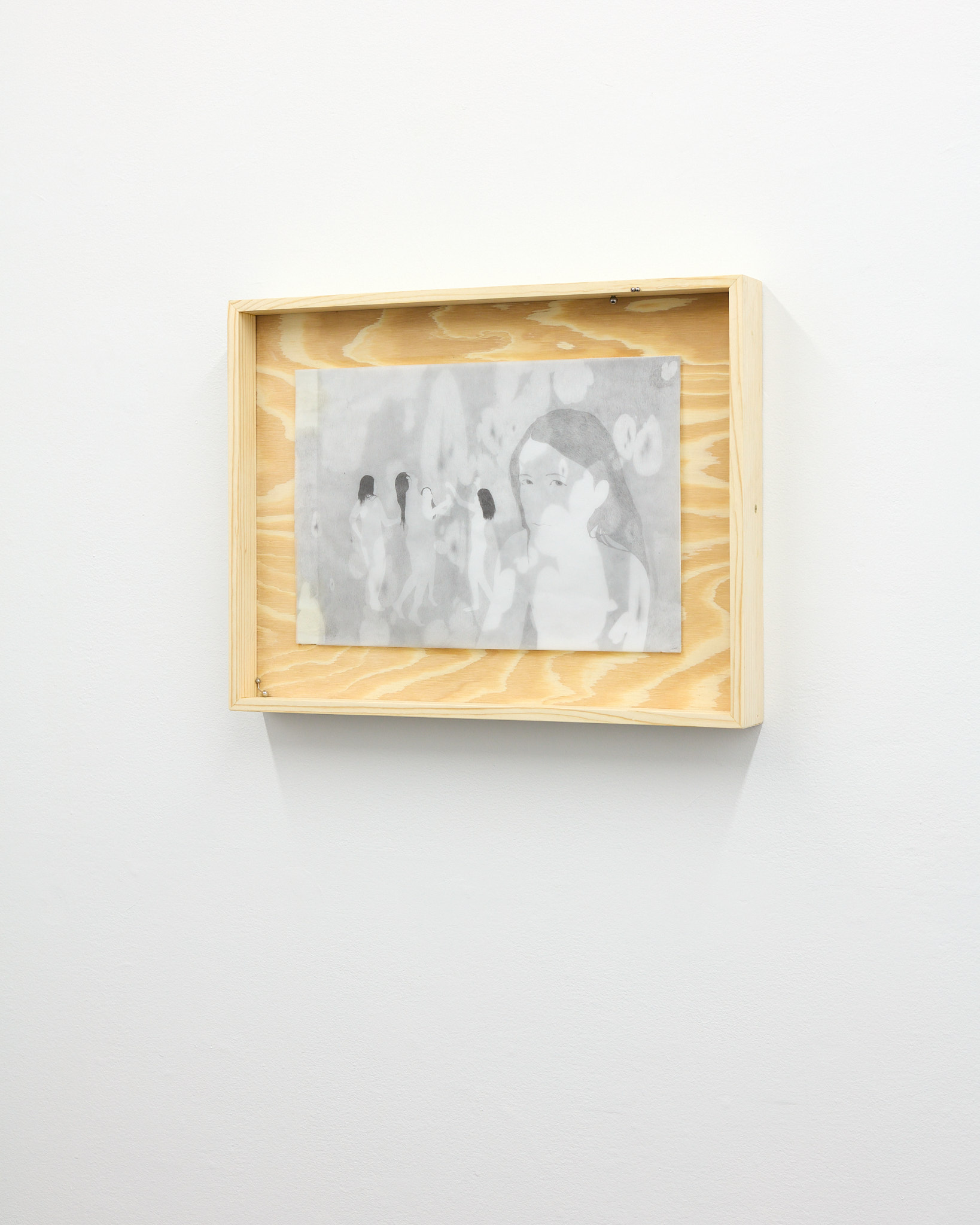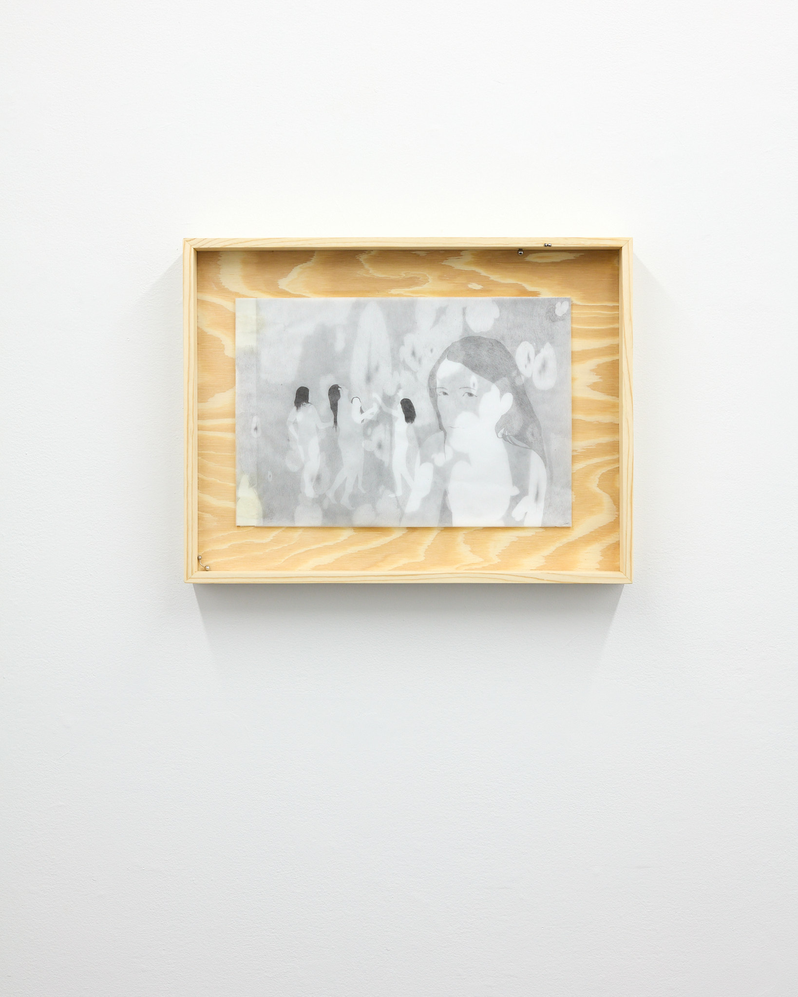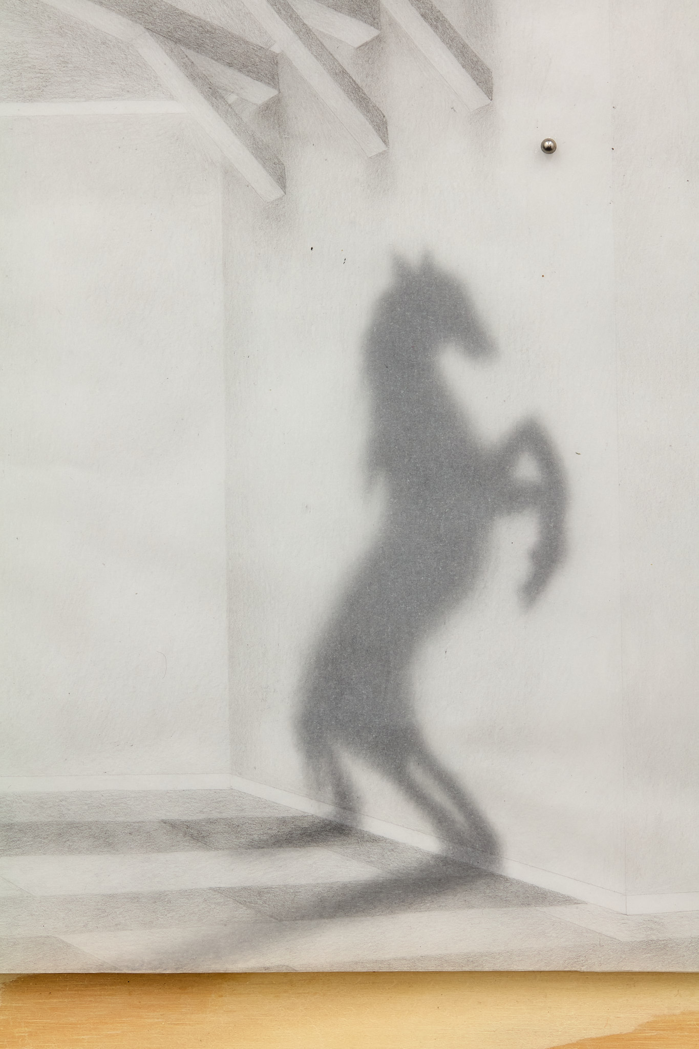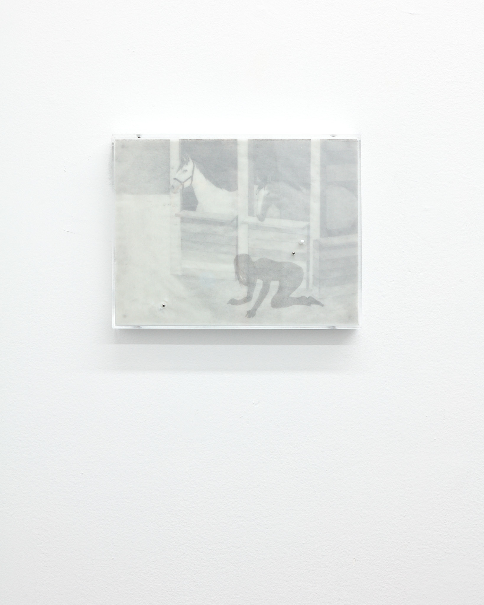 The term ‘mewl,’ a soft, plaintive cry, captures the quiet vulnerability and introspective nature that permeates Hawksley's work. Her graphite drawings depict figures in contemplative states, their interactions with horses or mirrors evoking a symbiotic exchange with their surroundings. These motifs epitomize the lasting navigation between internal desires and external expectations. The stacked substrates making up each drawing introduce a dynamic quality, allowing a fluid interplay of forms and dialogue within the composition, emphasizing the artist’s engagement with form and the inherent flexibility of the medium.